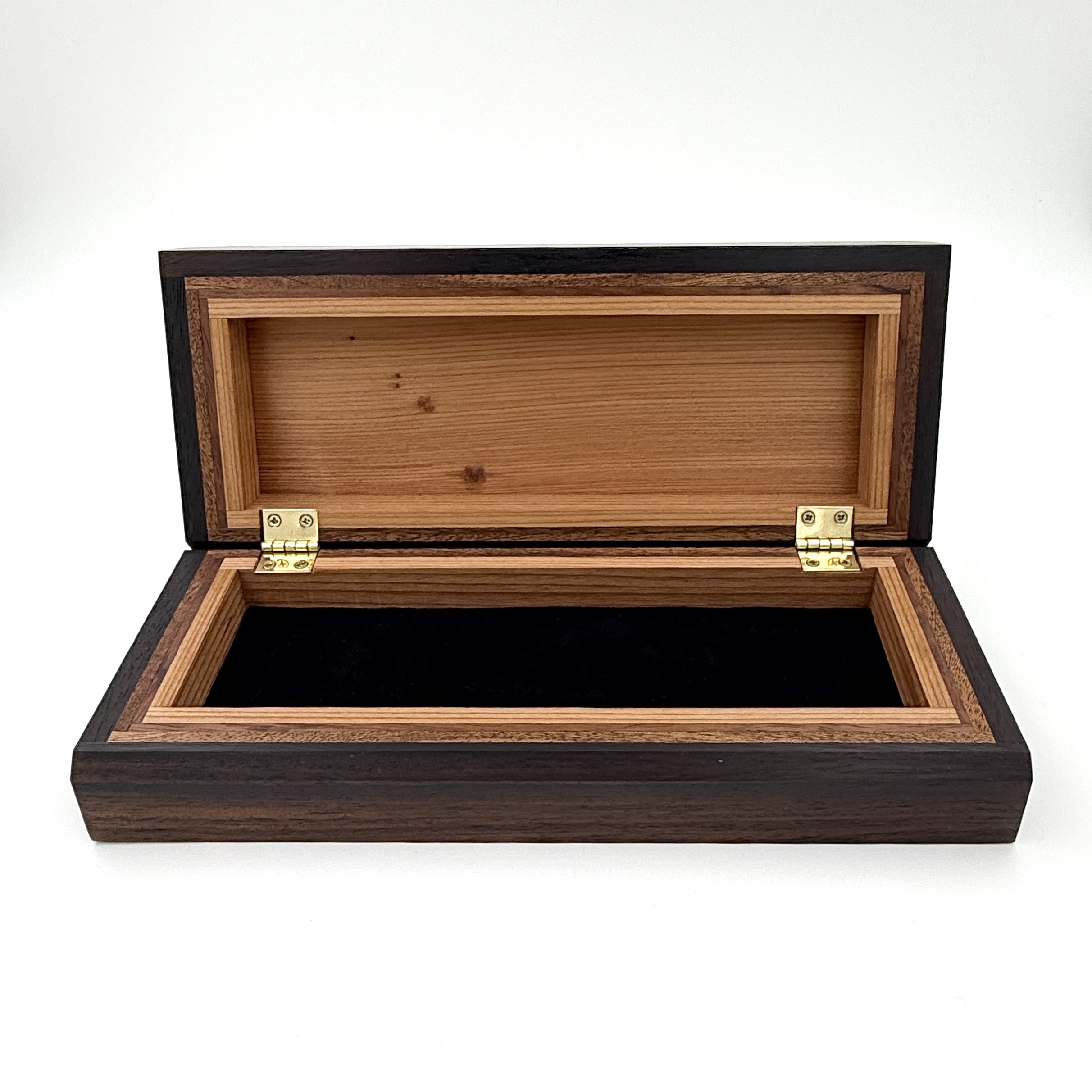 David and Kim made their first boxes in 1981. Before that David was a carpenter. Kim was a bank teller and had experience making jewelry. They combined David’s experience working with wood with Kim’s incredible eye for detail. They use only the finest, highly figured, hard to find legal woods on the planet. A clear oil finish and coat of paste wax on each box shows the true color of each wood.