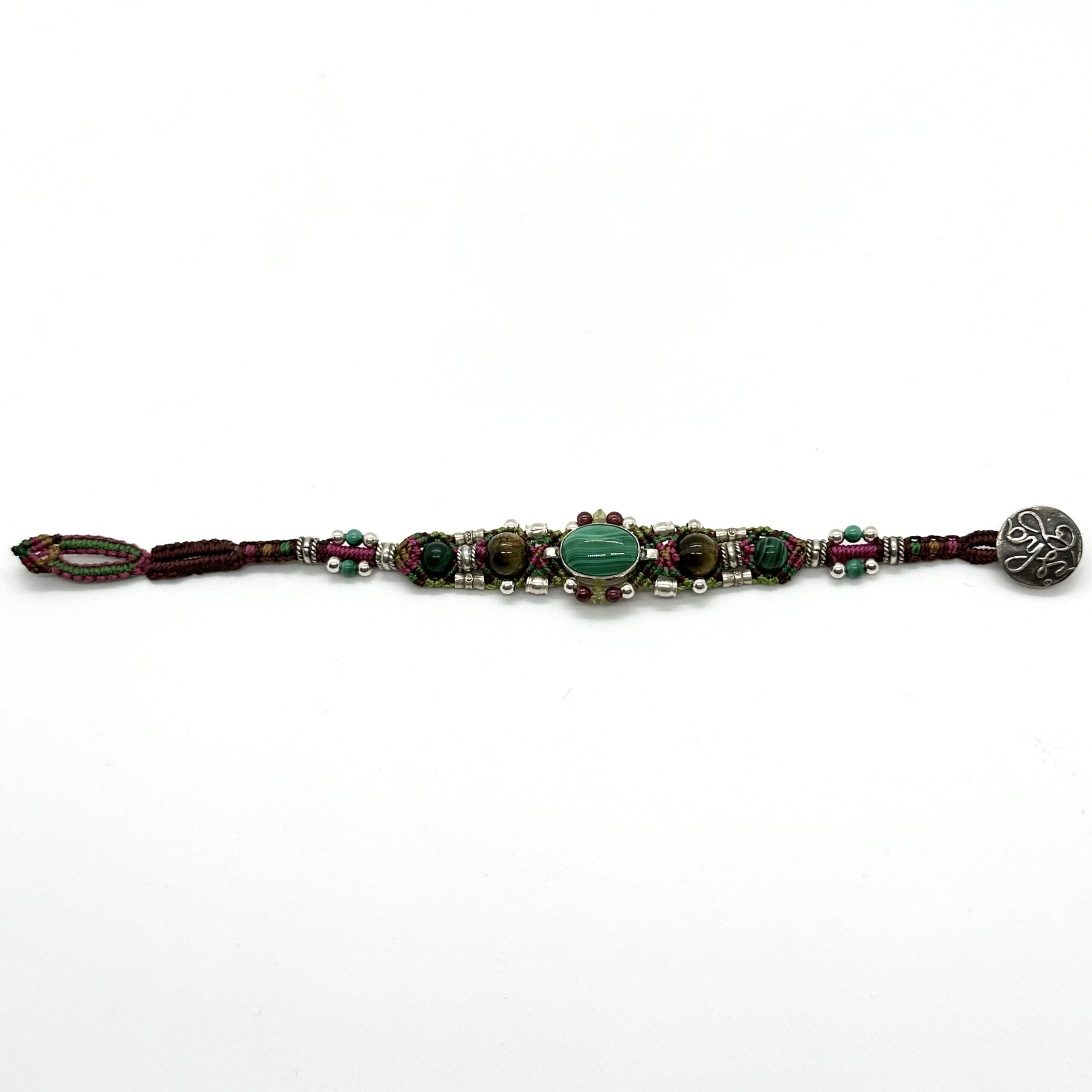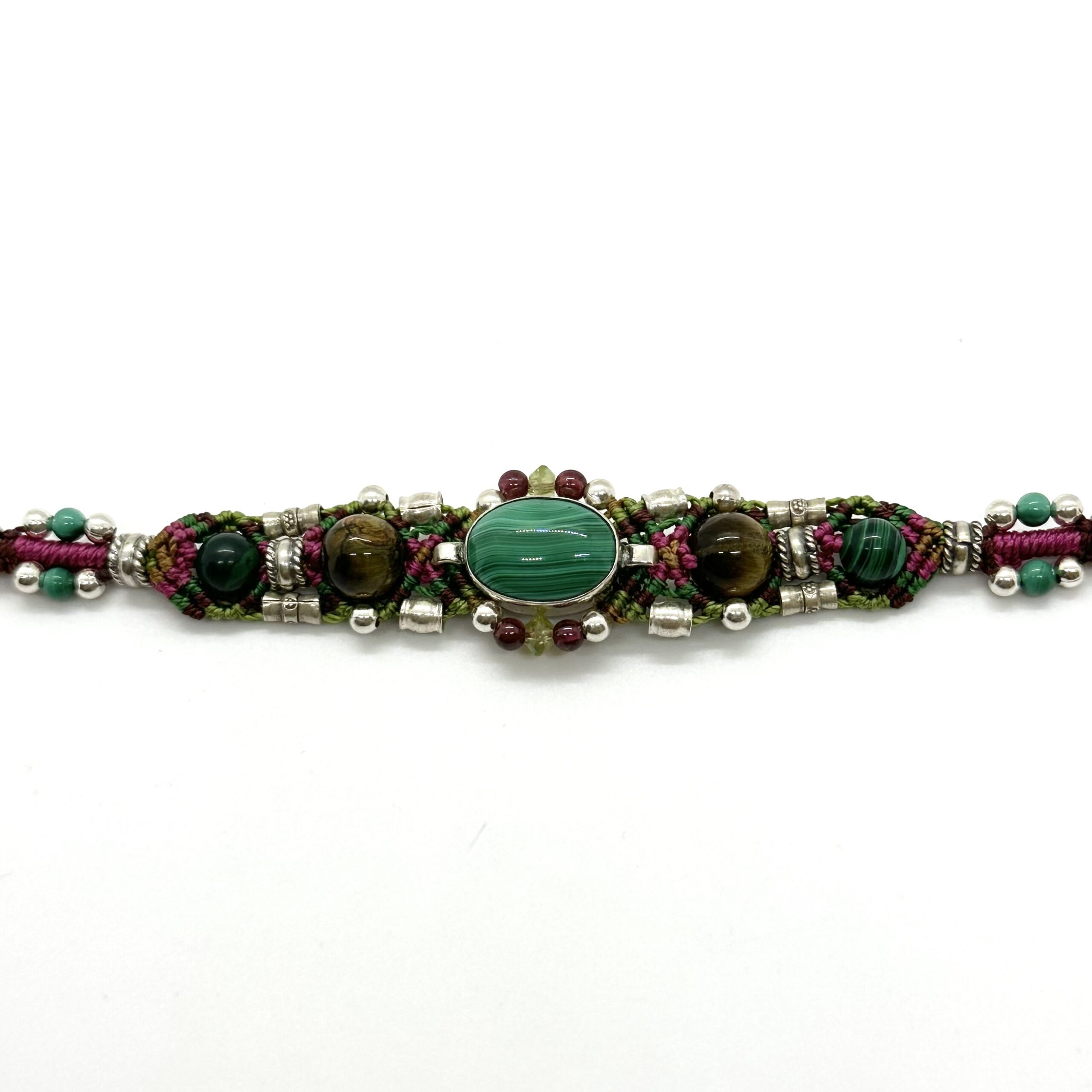 This is a narrow style bracelet of Isha Elafi,that can be stacked with other bracelets or worn alone.The center stone is a malachite with agate beads on each side of it.she has mixed green, brown, and fuchsia threads to compliment the stones. The length is 7 1/2″ with two buttonholes for adjustability.