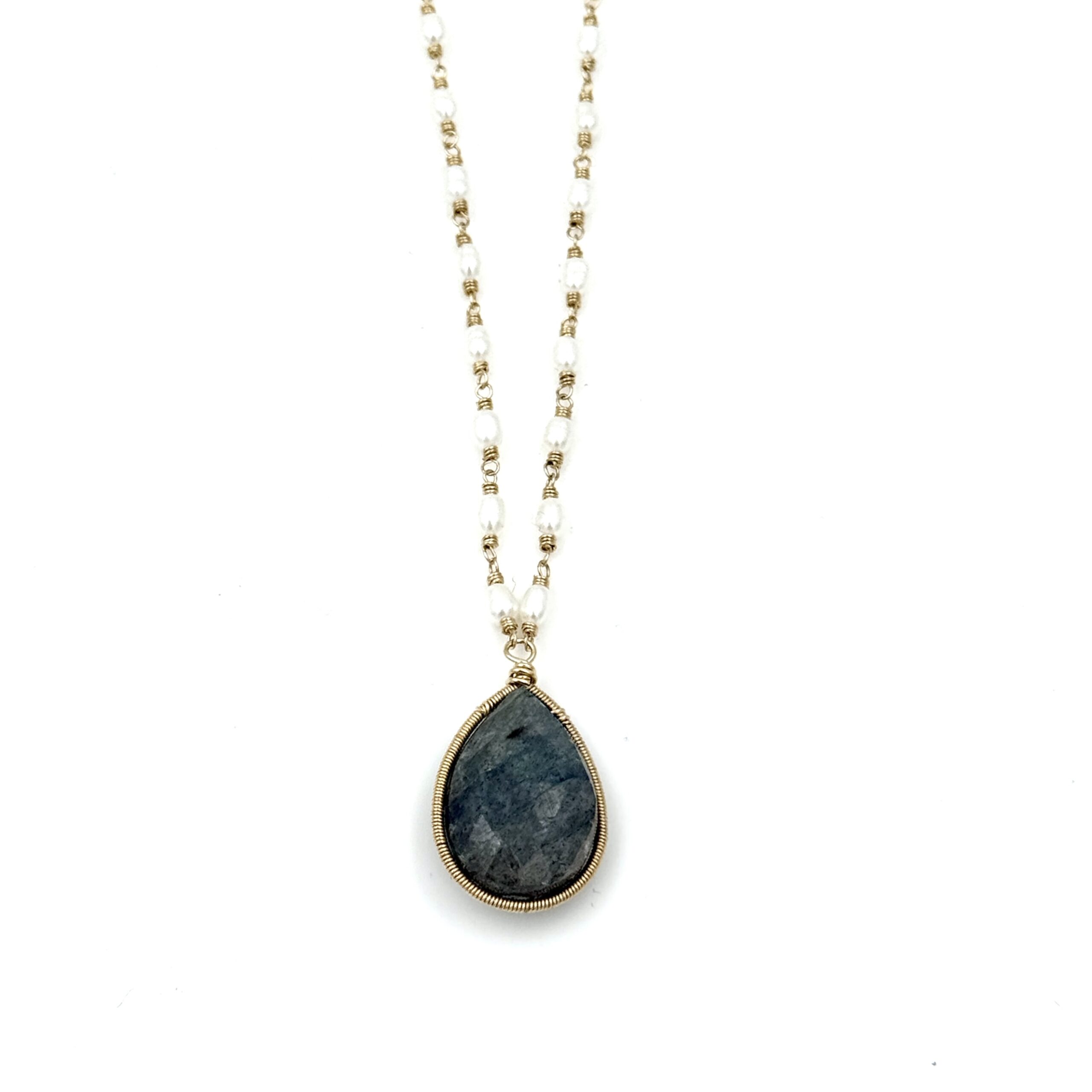 This necklace features a teardrop shaped faceted labradorite framed in a 14kt gold filled wire wrap. The necklace is 14kt gold filled with white fresh water pearls. This necklace is both classic and contemporary in design. It has three jump rings allowing it to be worn at 16″, 17″ and 18″ lengths.